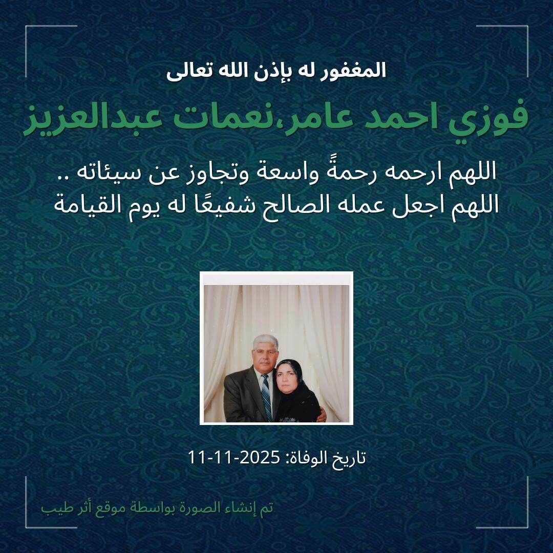 اللهمّ يمّن كتاب فوزي احمد عامر،نعمات عبدالعزيز ويسّر حسابه، وثقّل بالحسنات ميزانه، وثبّت على الصّراط أقدامه، وأسكنه في أعلى الجنّات، بجوار حبيبك ومصطفاك صلّى الله عليه وسلّم.