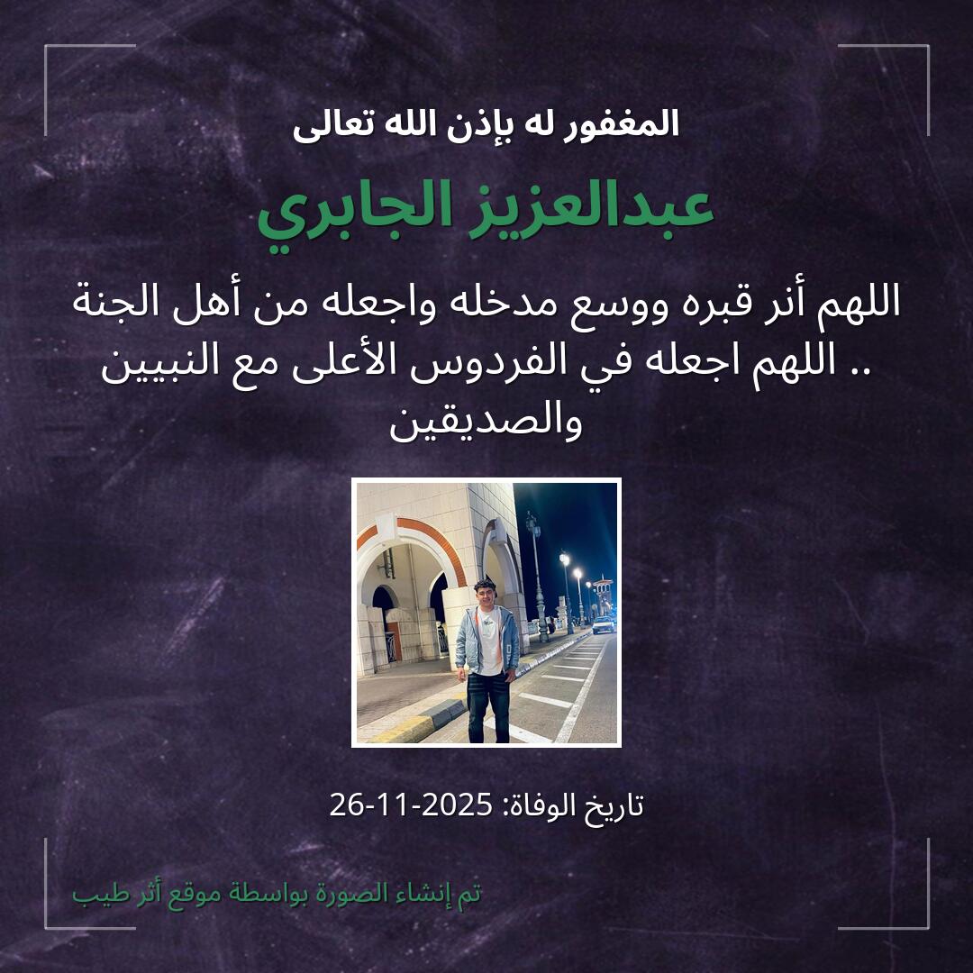 بمشاركتك هذه الصفحة، تساهم في نشر الخير والدعاء للمرحوم عبدالعزيز الجابري.