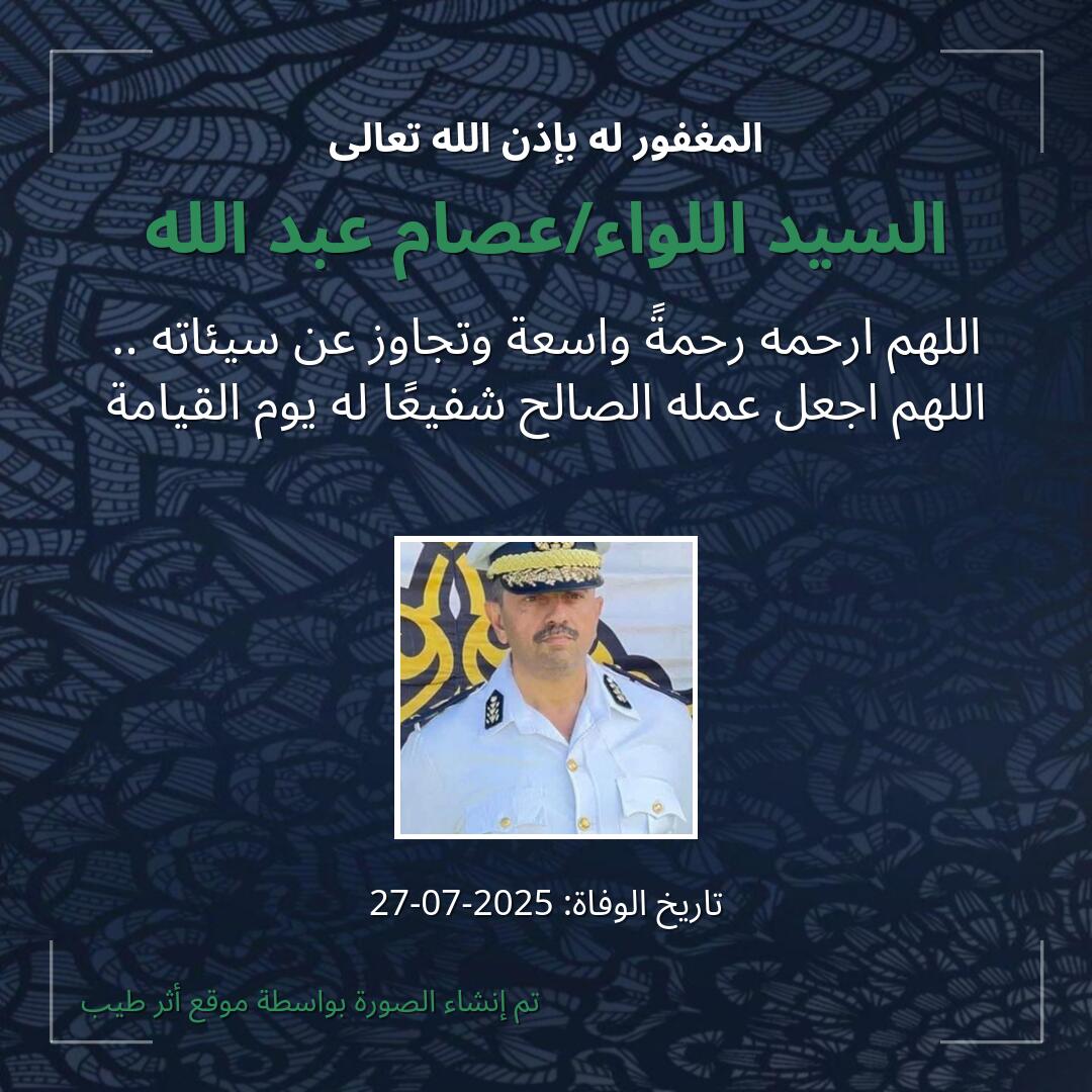 اللهمّ يمّن كتاب السيد اللواء/عصام عبد الله ويسّر حسابه، وثقّل بالحسنات ميزانه، وثبّت على الصّراط أقدامه، وأسكنه في أعلى الجنّات، بجوار حبيبك ومصطفاك صلّى الله عليه وسلّم.