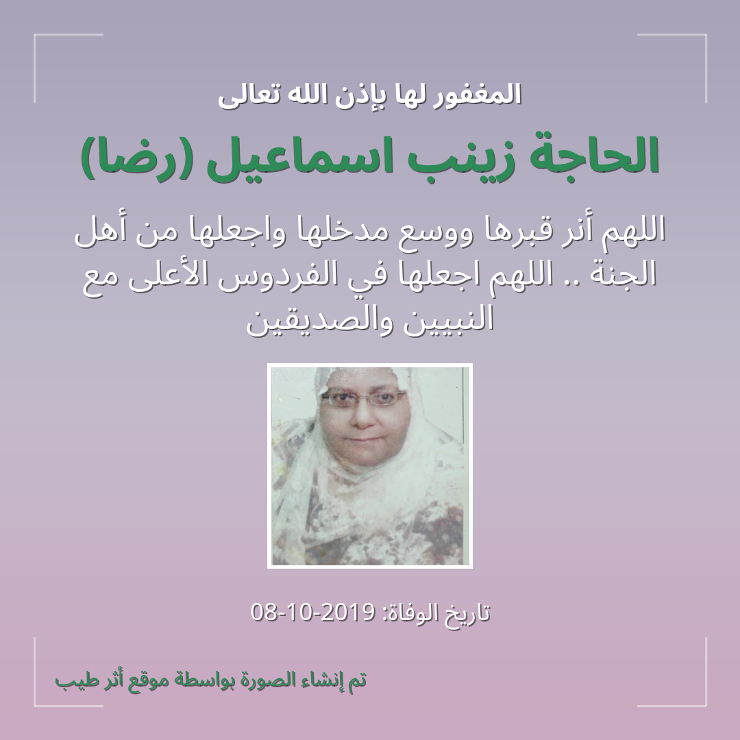 اللهم يمّن كتاب الحاجة زينب اسماعيل (رضا) ويسّر حسابها، وثقّل بالحسنات ميزانها، وثبّت على الصراط أقدامها، وأسكنها في أعلى الجنات بجوار حبيبك ومصطفاك صلّى الله عليه وسلّم.