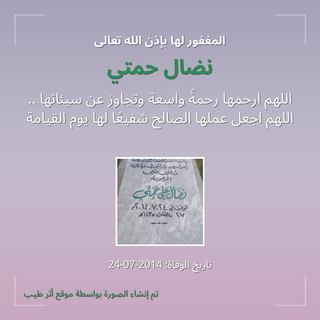 اللهم اجعل قبر نضال حمتي روضة من رياض الجنة، ولا تجعله حفرة من حفر النار، اللهم أسكنها الفردوس الأعلى من الجنة، وأنر قبرها ووسع مدخلها يا حليم يا غفار.
