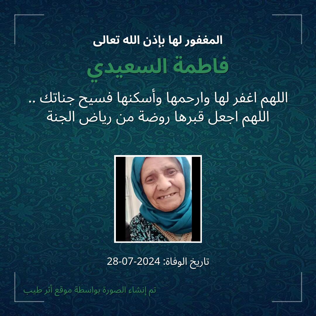 اللهم يا حنان يا منان يا واسع الغفران اغفر لـ فاطمة السعيدي وارحمها وعافها واعف عنها، وأكرم نزلها ووسع مدخلها، وأغسلها بالماء والثلج والبرد، ونقها من الذنوب والخطايا كما ينقى الثوب الأبيض من الدنس.