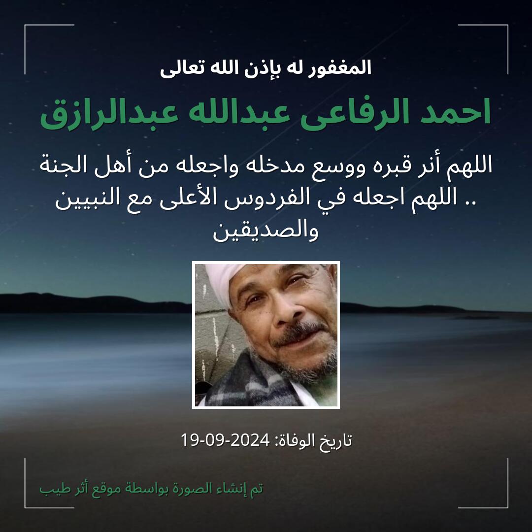 بمشاركتك هذه الصفحة، تساهم في نشر الخير والدعاء للمرحوم احمد الرفاعى عبدالله عبدالرازق.