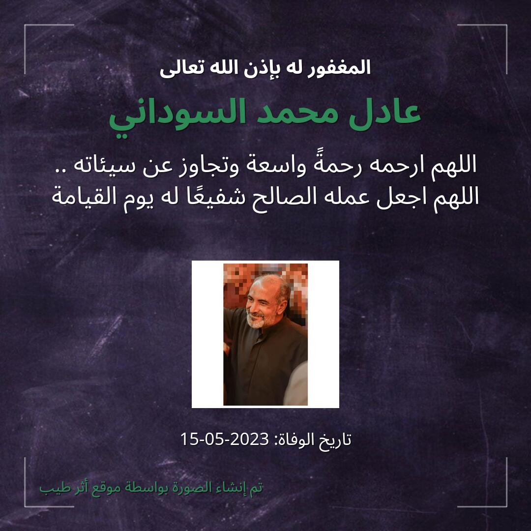 اللهم اجعل قبر عادل محمد السوداني روضة من رياض الجنة، ولا تجعله حفرة من حفر النار، اللهم أسكنه الفردوس الأعلى من الجنة، وأنر قبره ووسع مدخله.