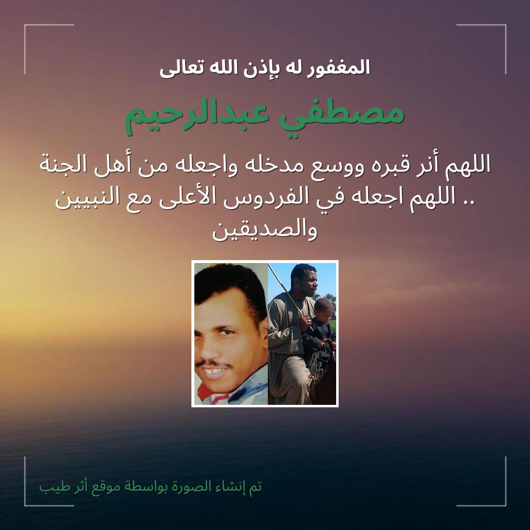 اللهم يا حنان يا منان يا واسع الغفران اغفر لـ مصطفي عبدالرحيم وارحمه وعافه واعف عنه، وأكرم نزله ووسع مدخله، وأغسله بالماء والثلج والبرد، ونقه من الذنوب والخطايا كما ينقى الثوب الأبيض من الدنس.