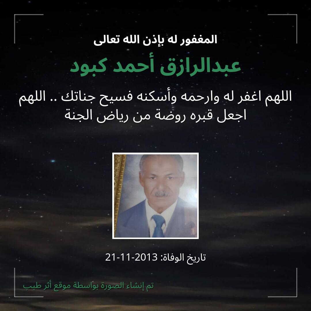 بمشاركتك هذه الصفحة، تساهم في نشر الخير والدعاء للمرحوم عبدالرازق أحمد كبود.