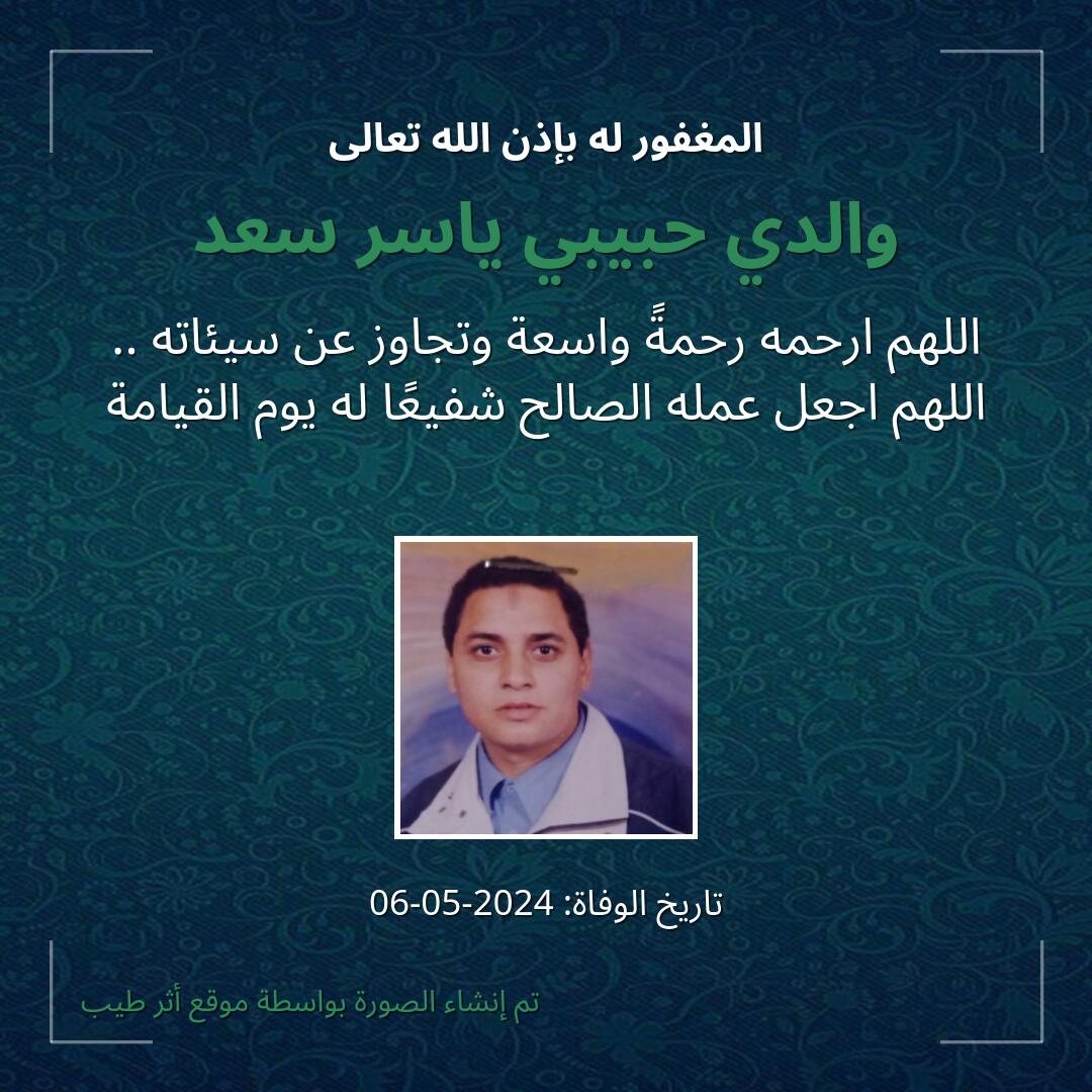 اللهمّ يمّن كتاب والدي حبيبي ياسر سعد ويسّر حسابه، وثقّل بالحسنات ميزانه، وثبّت على الصّراط أقدامه، وأسكنه في أعلى الجنّات، بجوار حبيبك ومصطفاك صلّى الله عليه وسلّم.