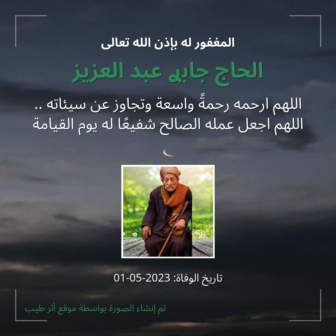 اللهم يا حنان يا منان يا واسع الغفران اغفر لـ الحاج جابࢪ عبد العزيز وارحمه وعافه واعف عنه، وأكرم نزله ووسع مدخله، وأغسله بالماء والثلج والبرد، ونقه من الذنوب والخطايا كما ينقى الثوب الأبيض من الدنس.