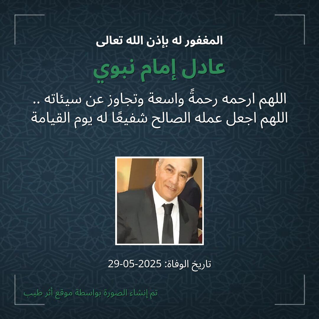 اللهمّ يمّن كتاب عادل إمام نبوي ويسّر حسابه، وثقّل بالحسنات ميزانه، وثبّت على الصّراط أقدامه، وأسكنه في أعلى الجنّات، بجوار حبيبك ومصطفاك صلّى الله عليه وسلّم.