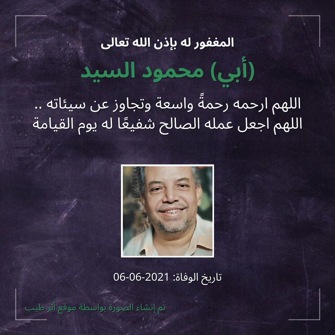 اللهم يا حنان يا منان يا واسع الغفران اغفر لـ (أبي) محمود السيد وارحمه وعافه واعف عنه، وأكرم نزله ووسع مدخله، وأغسله بالماء والثلج والبرد، ونقه من الذنوب والخطايا كما ينقى الثوب الأبيض من الدنس.