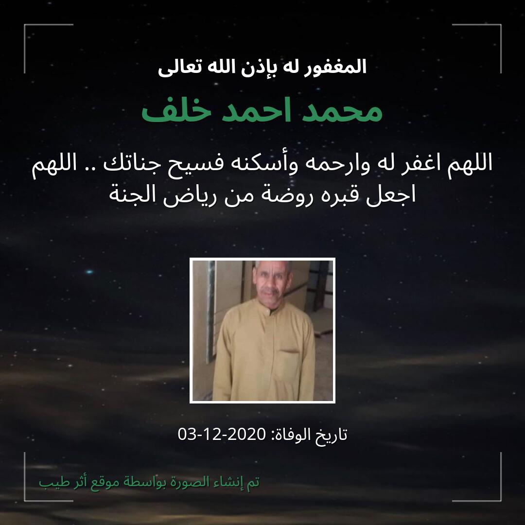 اللهم يا حنان يا منان يا واسع الغفران اغفر لـ محمد احمد خلف وارحمه وعافه واعف عنه، وأكرم نزله ووسع مدخله، وأغسله بالماء والثلج والبرد، ونقه من الذنوب والخطايا كما ينقى الثوب الأبيض من الدنس.