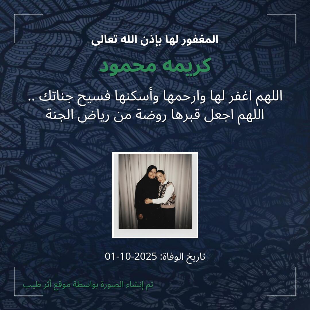 بمشاركتك هذه الصفحة، تساهم في نشر الخير والدعاء للمرحومة كريمه محمود.