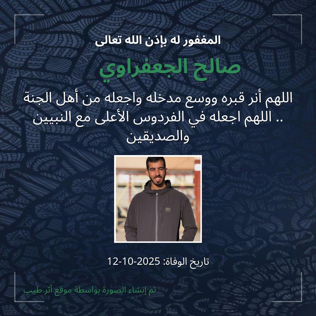 اللهم يا حنان يا منان يا واسع الغفران اغفر لـ صالح الجعفراوي😔💔 وارحمه وعافه واعف عنه، وأكرم نزله ووسع مدخله، وأغسله بالماء والثلج والبرد، ونقه من الذنوب والخطايا كما ينقى الثوب الأبيض من الدنس.