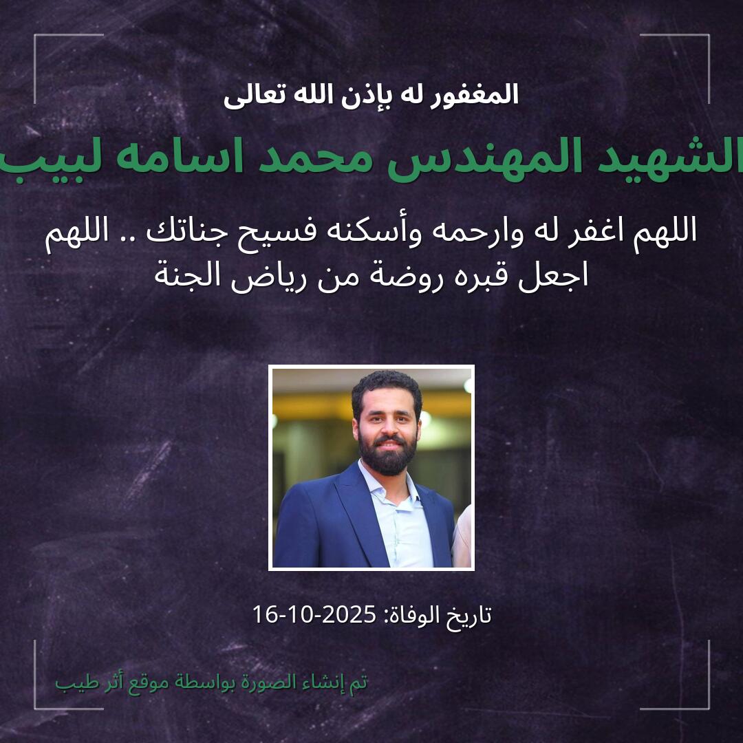 اللهم يا حنان يا منان يا واسع الغفران اغفر لـ الشهيد المهندس محمد اسامه لبيب وارحمه وعافه واعف عنه، وأكرم نزله ووسع مدخله، وأغسله بالماء والثلج والبرد، ونقه من الذنوب والخطايا كما ينقى الثوب الأبيض من الدنس.