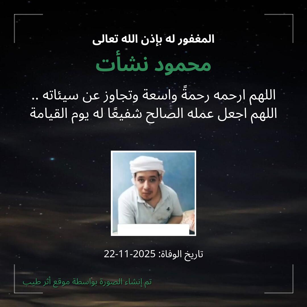 اللهمّ يمّن كتاب محمود نشأت ويسّر حسابه، وثقّل بالحسنات ميزانه، وثبّت على الصّراط أقدامه، وأسكنه في أعلى الجنّات، بجوار حبيبك ومصطفاك صلّى الله عليه وسلّم.