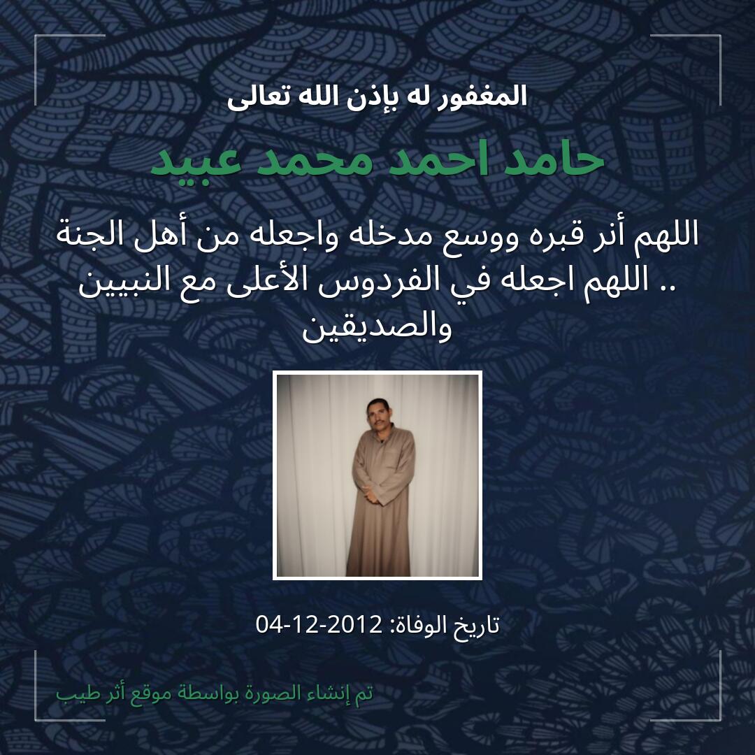 اللهم يا حنان يا منان يا واسع الغفران اغفر لـ حامد احمد محمد عبيد وارحمه وعافه واعف عنه، وأكرم نزله ووسع مدخله، وأغسله بالماء والثلج والبرد، ونقه من الذنوب والخطايا كما ينقى الثوب الأبيض من الدنس.
