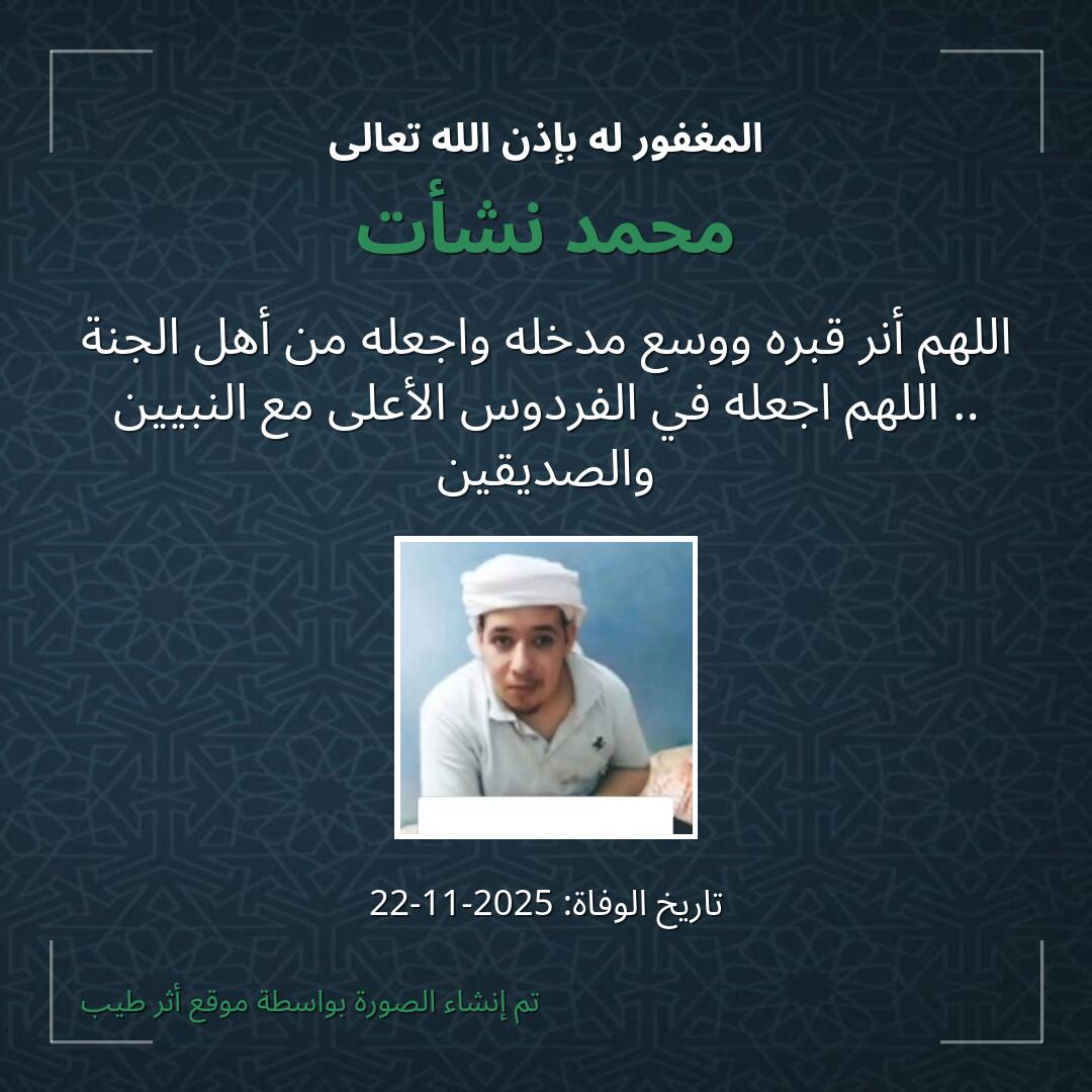 اللهمّ يمّن كتاب محمد نشأت ويسّر حسابه، وثقّل بالحسنات ميزانه، وثبّت على الصّراط أقدامه، وأسكنه في أعلى الجنّات، بجوار حبيبك ومصطفاك صلّى الله عليه وسلّم.