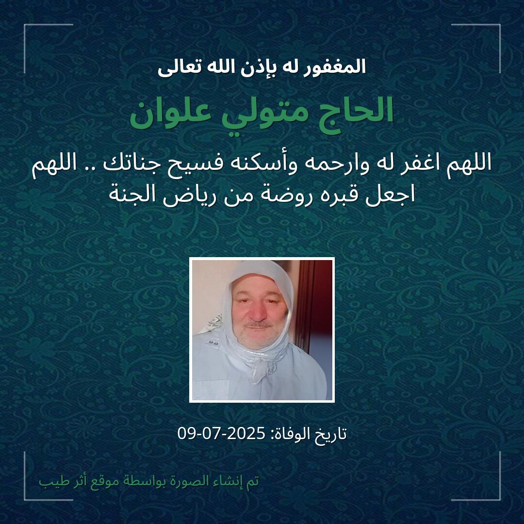اللهمّ يمّن كتاب الحاج متولي علوان ويسّر حسابه، وثقّل بالحسنات ميزانه، وثبّت على الصّراط أقدامه، وأسكنه في أعلى الجنّات، بجوار حبيبك ومصطفاك صلّى الله عليه وسلّم.