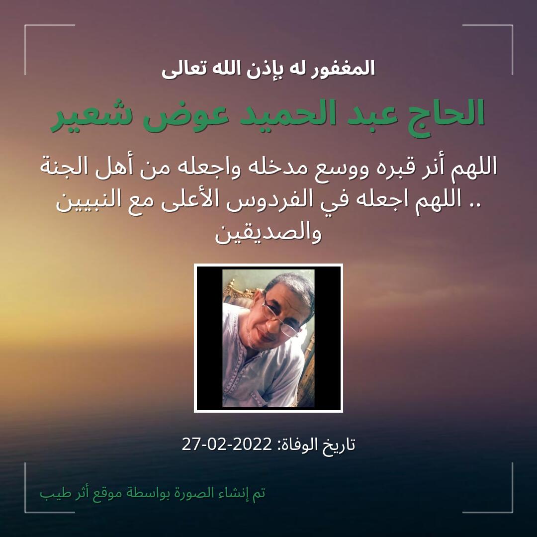 اللهمّ يمّن كتاب الحاج عبد الحميد عوض شعير ويسّر حسابه، وثقّل بالحسنات ميزانه، وثبّت على الصّراط أقدامه، وأسكنه في أعلى الجنّات، بجوار حبيبك ومصطفاك صلّى الله عليه وسلّم.