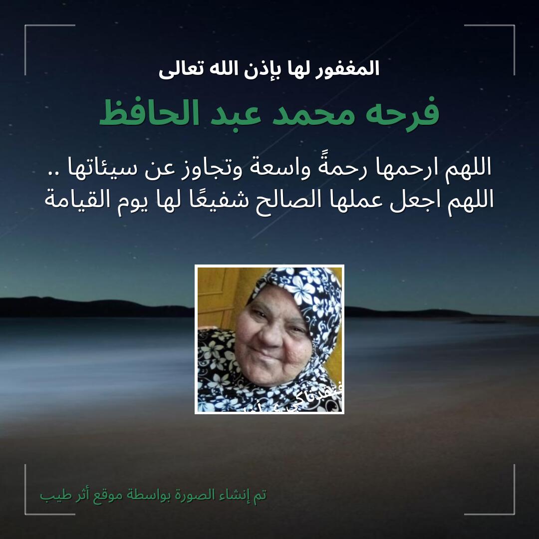 بمشاركتك هذه الصفحة، تساهم في نشر الخير والدعاء للمرحومة فرحه محمد عبد الحافظ.