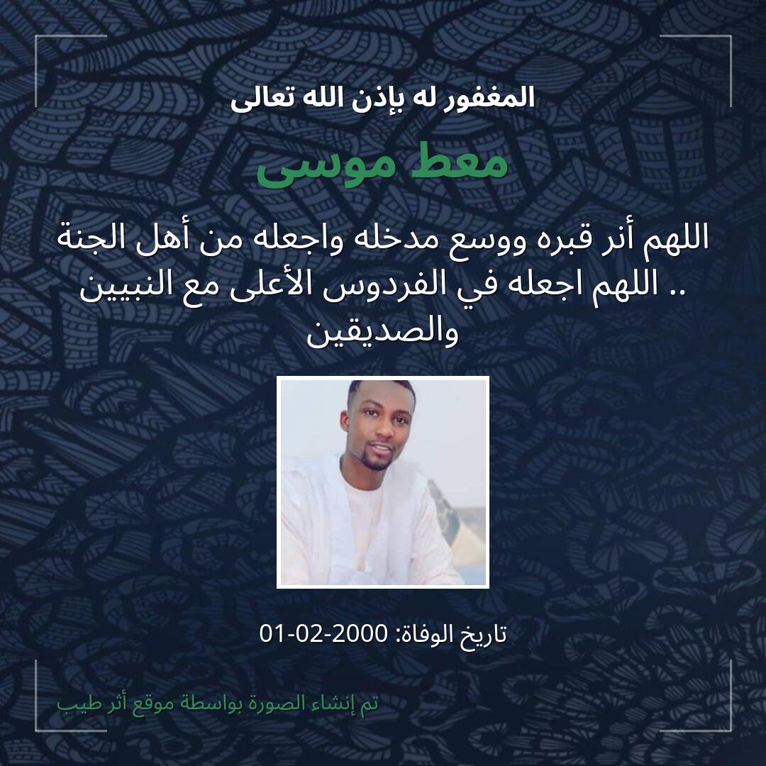 اللهمّ يمّن كتاب معط موسى ويسّر حسابه، وثقّل بالحسنات ميزانه، وثبّت على الصّراط أقدامه، وأسكنه في أعلى الجنّات، بجوار حبيبك ومصطفاك صلّى الله عليه وسلّم.