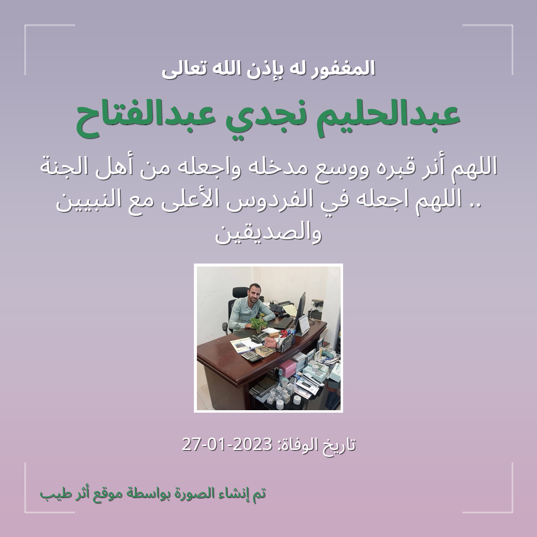 بمشاركتك هذه الصفحة، تساهم في نشر الخير والدعاء للمرحوم عبدالحليم نجدي عبدالفتاح.