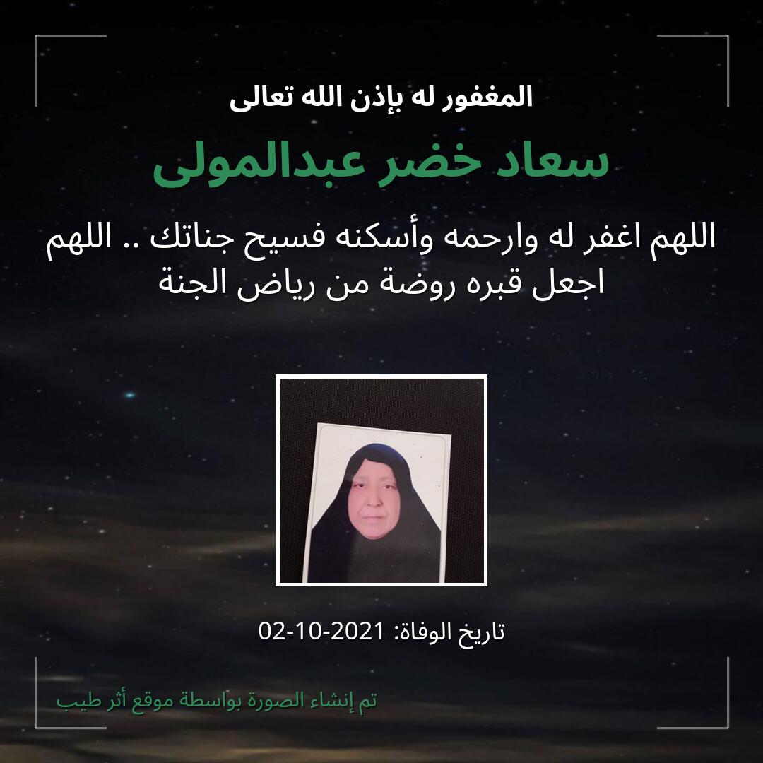اللهم يا حنان يا منان يا واسع الغفران اغفر لـ سعاد خضر عبدالمولى وارحمه وعافه واعف عنه، وأكرم نزله ووسع مدخله، وأغسله بالماء والثلج والبرد، ونقه من الذنوب والخطايا كما ينقى الثوب الأبيض من الدنس.