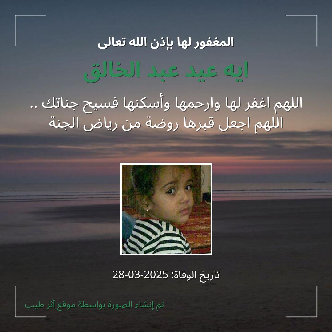 بمشاركتك هذه الصفحة، تساهم في نشر الخير والدعاء للمرحومة ايه عيد عبد الخالق.