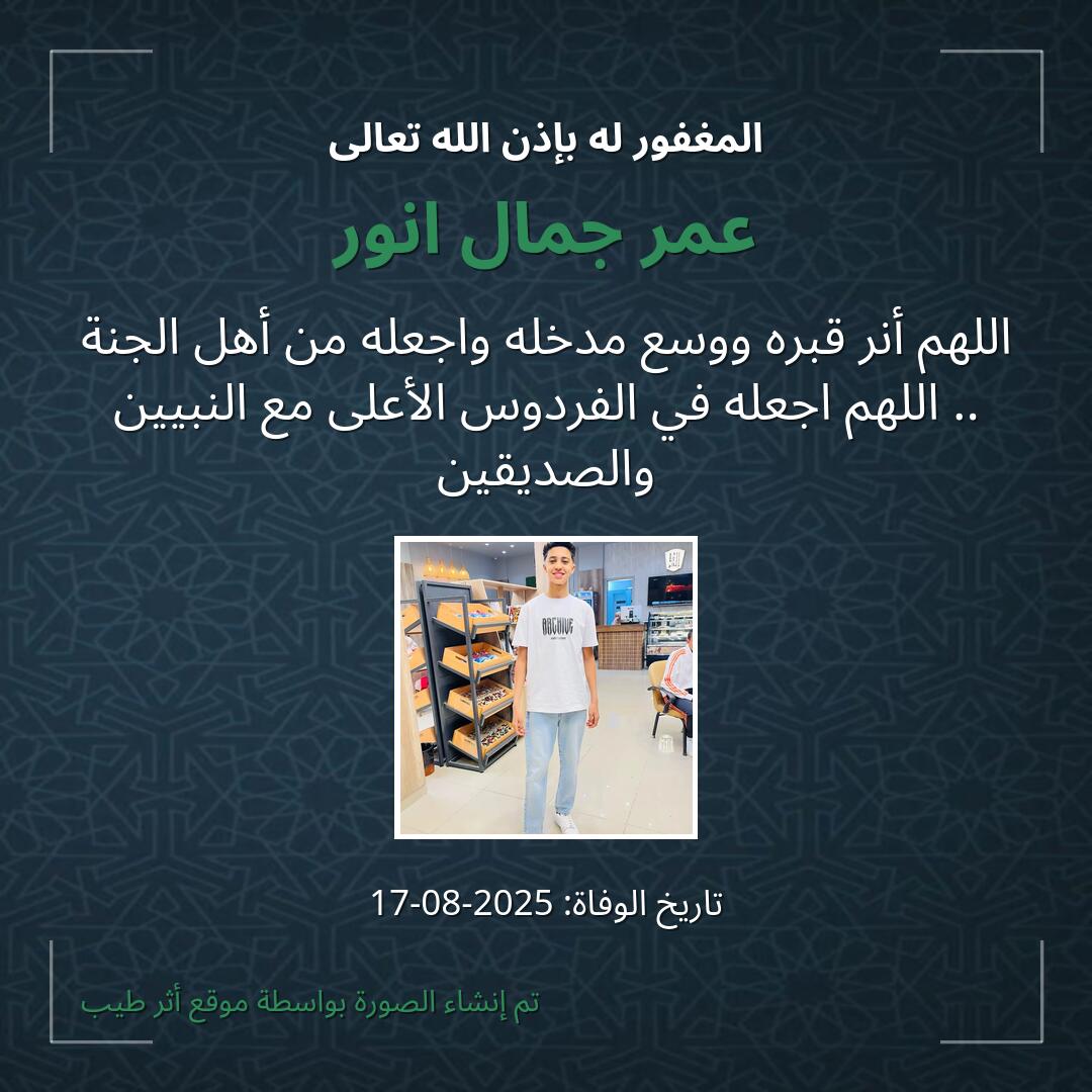 اللهم يا حنان يا منان يا واسع الغفران اغفر لـ عمر جمال انور وارحمه وعافه واعف عنه، وأكرم نزله ووسع مدخله، وأغسله بالماء والثلج والبرد، ونقه من الذنوب والخطايا كما ينقى الثوب الأبيض من الدنس.