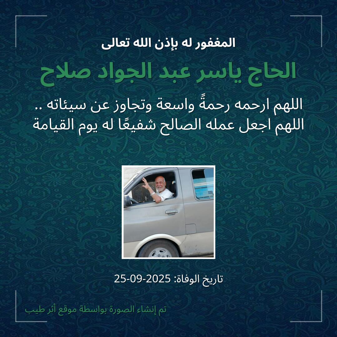 بمشاركتك هذه الصفحة، تساهم في نشر الخير والدعاء للمرحوم الحاج ياسر عبد الجواد صلاح.