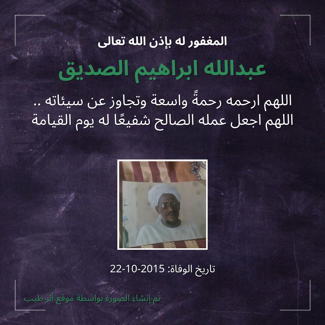 اللهم يا حنان يا منان يا واسع الغفران اغفر لـ عبدالله ابراهيم الصديق وارحمه وعافه واعف عنه، وأكرم نزله ووسع مدخله، وأغسله بالماء والثلج والبرد، ونقه من الذنوب والخطايا كما ينقى الثوب الأبيض من الدنس.