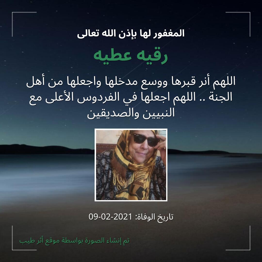 اللهم يا حنان يا منان يا واسع الغفران اغفر لـ رقيه عطيه وارحمها وعافها واعف عنها، وأكرم نزلها ووسع مدخلها، وأغسلها بالماء والثلج والبرد، ونقها من الذنوب والخطايا كما ينقى الثوب الأبيض من الدنس.