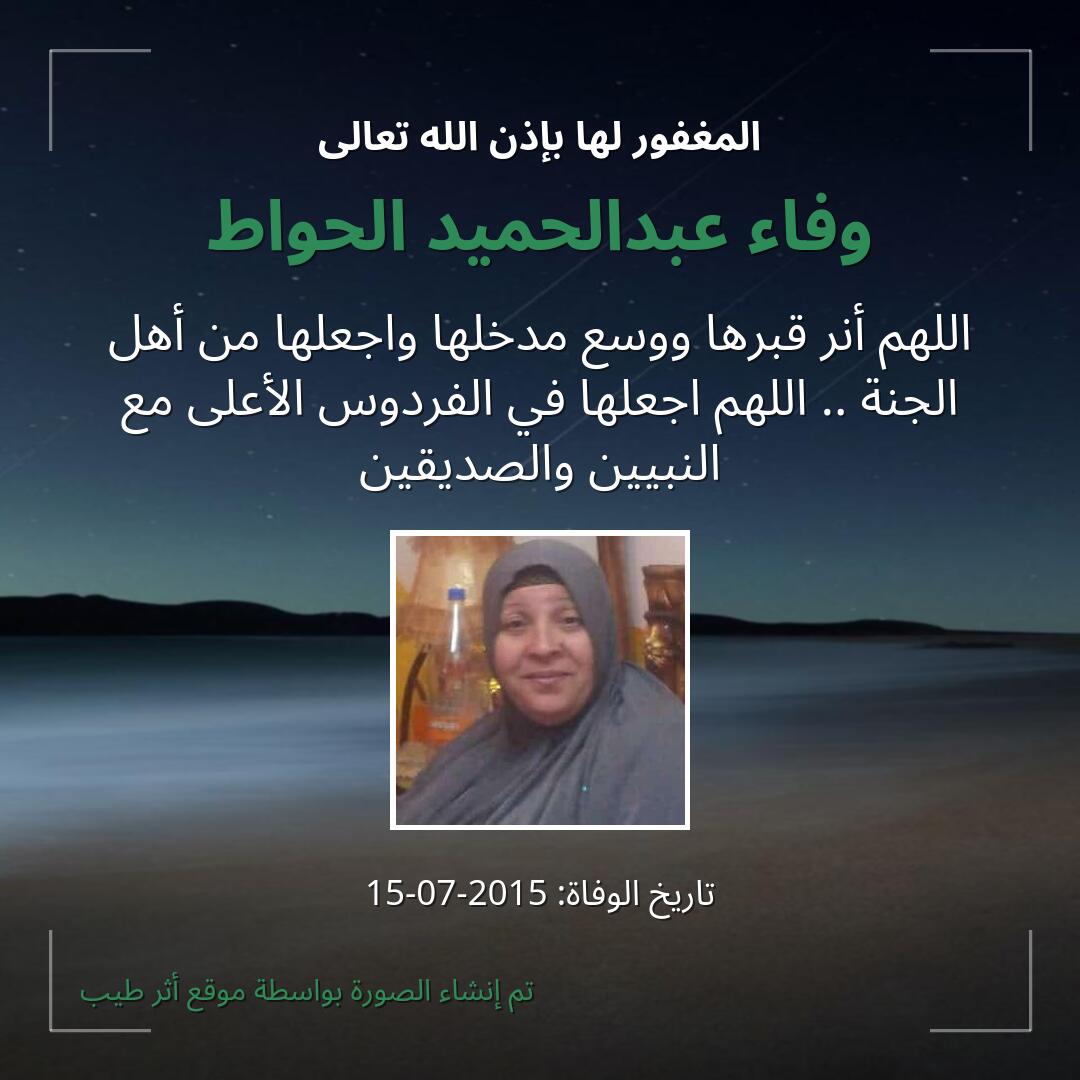 اللهم اجعل قبر وفاء عبدالحميد الحواط روضة من رياض الجنة، ولا تجعله حفرة من حفر النار، اللهم أسكنها الفردوس الأعلى من الجنة، وأنر قبرها ووسع مدخلها يا حليم يا غفار.