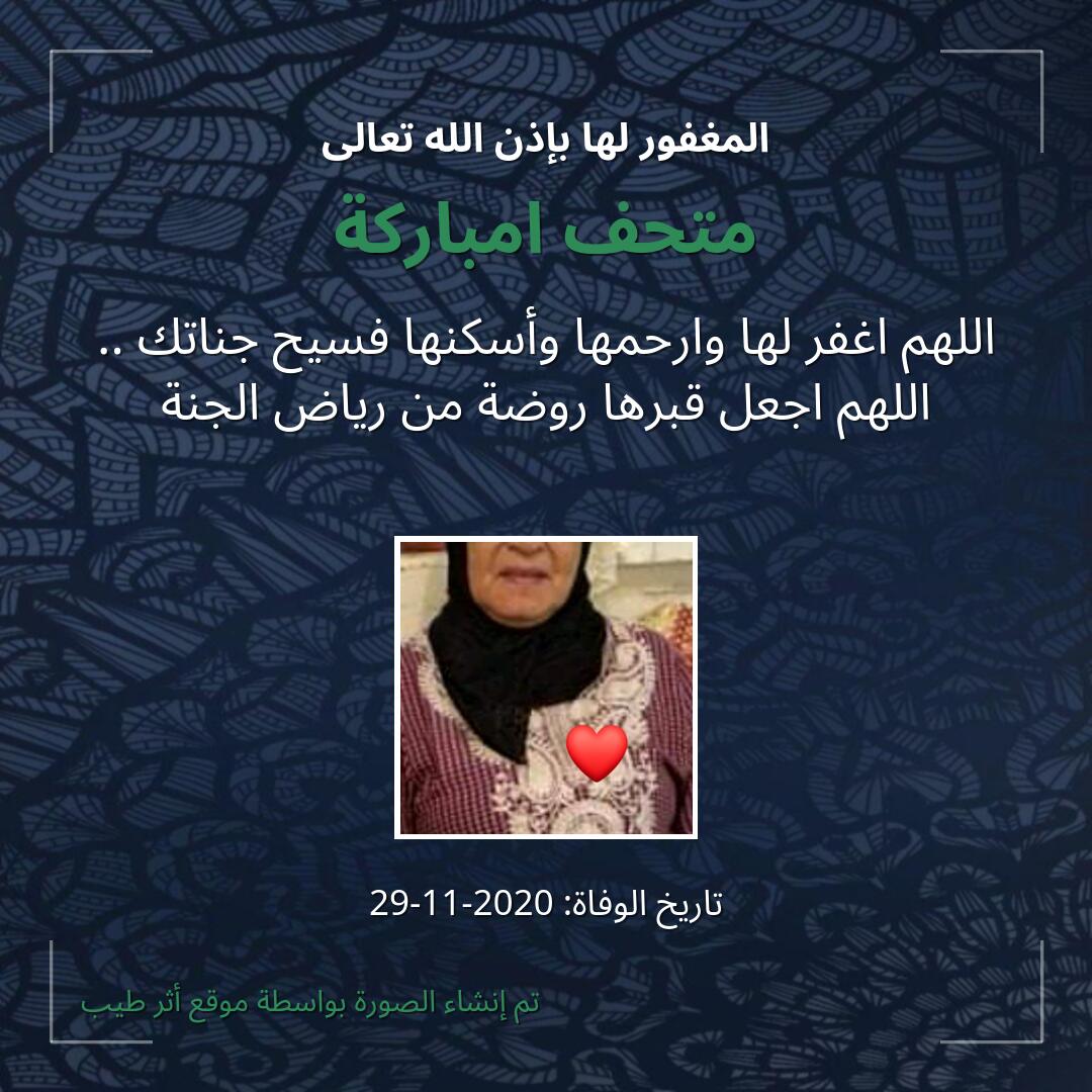 اللهم يا حنان يا منان يا واسع الغفران اغفر لـ متحف امباركة وارحمها وعافها واعف عنها، وأكرم نزلها ووسع مدخلها، وأغسلها بالماء والثلج والبرد، ونقها من الذنوب والخطايا كما ينقى الثوب الأبيض من الدنس.