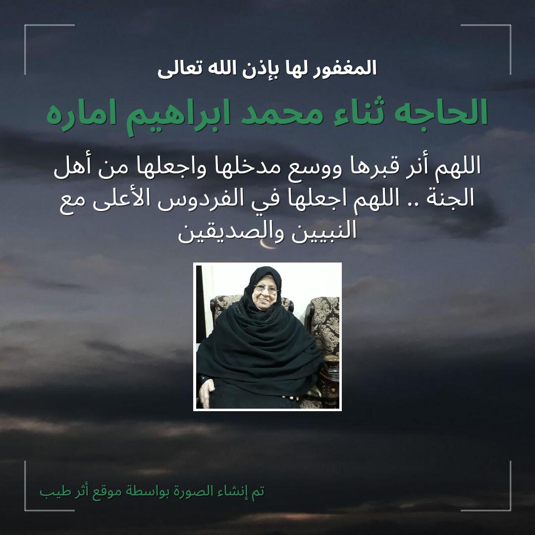 اللهم يا حنان يا منان يا واسع الغفران اغفر لـ الحاجه ثناء محمد ابراهيم اماره وارحمها وعافها واعف عنها، وأكرم نزلها ووسع مدخلها، وأغسلها بالماء والثلج والبرد، ونقها من الذنوب والخطايا كما ينقى الثوب الأبيض من الدنس.