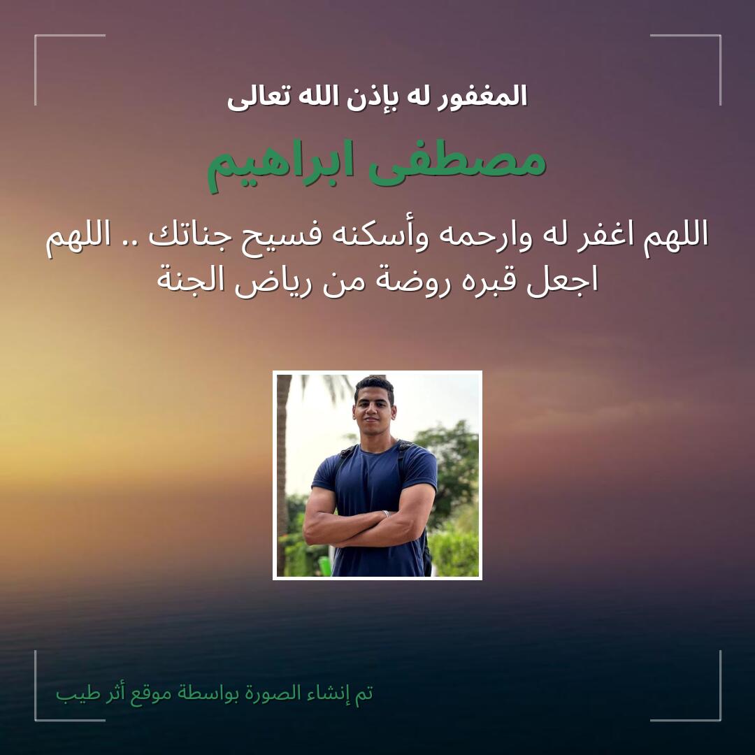 اللهم يا حنان يا منان يا واسع الغفران اغفر لـ مصطفى ابراهيم وارحمه وعافه واعف عنه، وأكرم نزله ووسع مدخله، وأغسله بالماء والثلج والبرد، ونقه من الذنوب والخطايا كما ينقى الثوب الأبيض من الدنس.