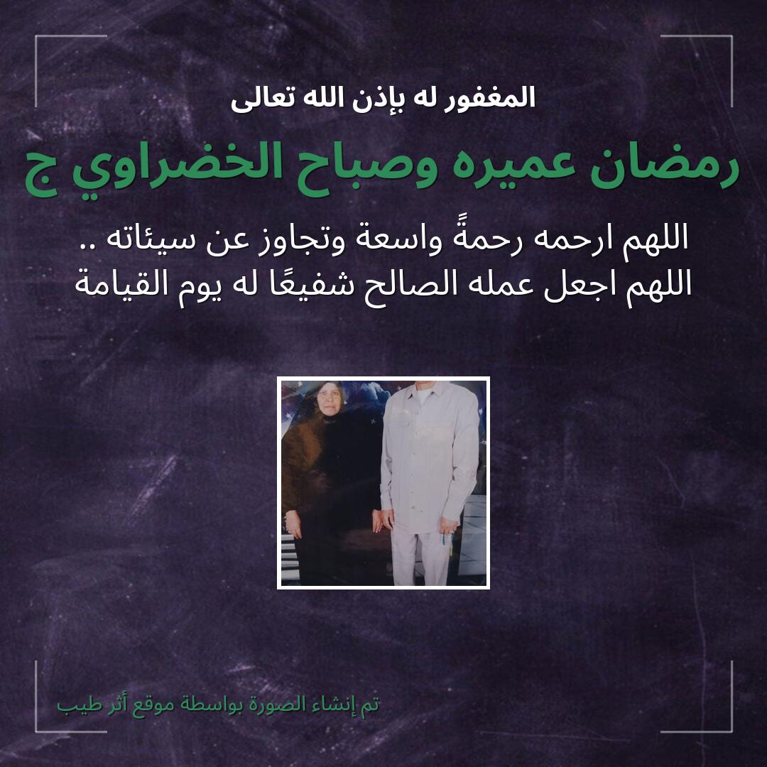 اللهم يا حنان يا منان يا واسع الغفران اغفر لـ رمضان عميره وصباح الخضراوي ج وارحمه وعافه واعف عنه، وأكرم نزله ووسع مدخله، وأغسله بالماء والثلج والبرد، ونقه من الذنوب والخطايا كما ينقى الثوب الأبيض من الدنس.