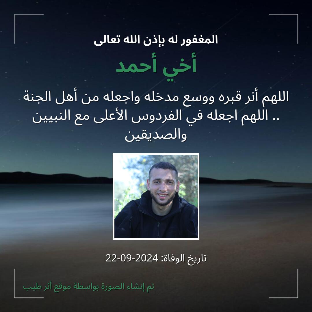 اللهمّ يمّن كتاب أخي أحمد ويسّر حسابه، وثقّل بالحسنات ميزانه، وثبّت على الصّراط أقدامه، وأسكنه في أعلى الجنّات، بجوار حبيبك ومصطفاك صلّى الله عليه وسلّم.