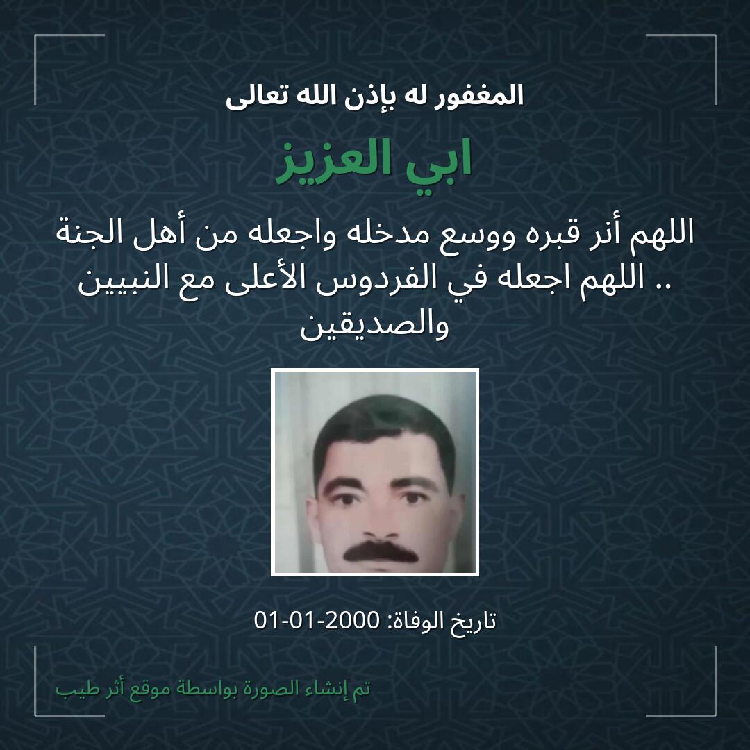 اللهم اجعل عن يمين ابي العزيز نورًا، حتى تبعثه آمنًا مطمئنًا في نورٍ من نورك. اللهمّ انظر إليه نظرة رضا، فإنّ من تنظُر إليه نظرة رضًا لا تعذّبه أبدًا. اللهمّ أسكنه فسيح الجنان، واغفر له يا رحمن، وارحمه يا رحيم، وتجاوز عمّا تعلم يا عليم. اللهمّ اعف عنه، فإنّك القائل ويعفو عن كثير.
