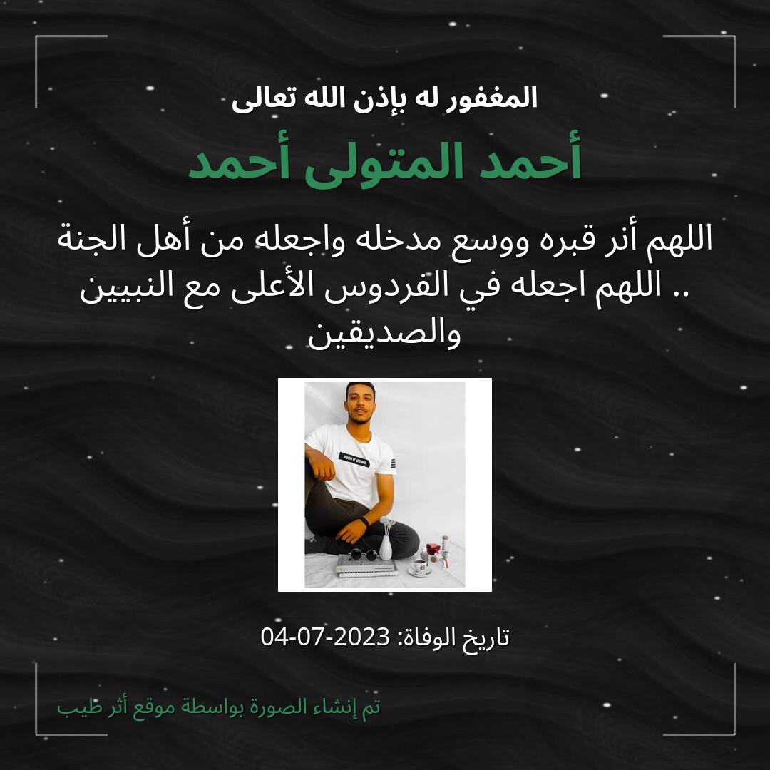 اللهم يا حنان يا منان يا واسع الغفران اغفر لـ أحمد المتولى أحمد وارحمه وعافه واعف عنه، وأكرم نزله ووسع مدخله، وأغسله بالماء والثلج والبرد، ونقه من الذنوب والخطايا كما ينقى الثوب الأبيض من الدنس.