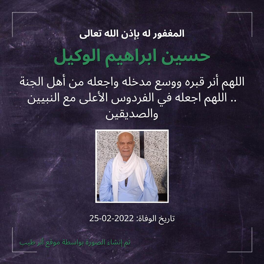اللهم يا حنان يا منان يا واسع الغفران اغفر لـ حسين ابراهيم الوكيل وارحمه وعافه واعف عنه، وأكرم نزله ووسع مدخله، وأغسله بالماء والثلج والبرد، ونقه من الذنوب والخطايا كما ينقى الثوب الأبيض من الدنس.