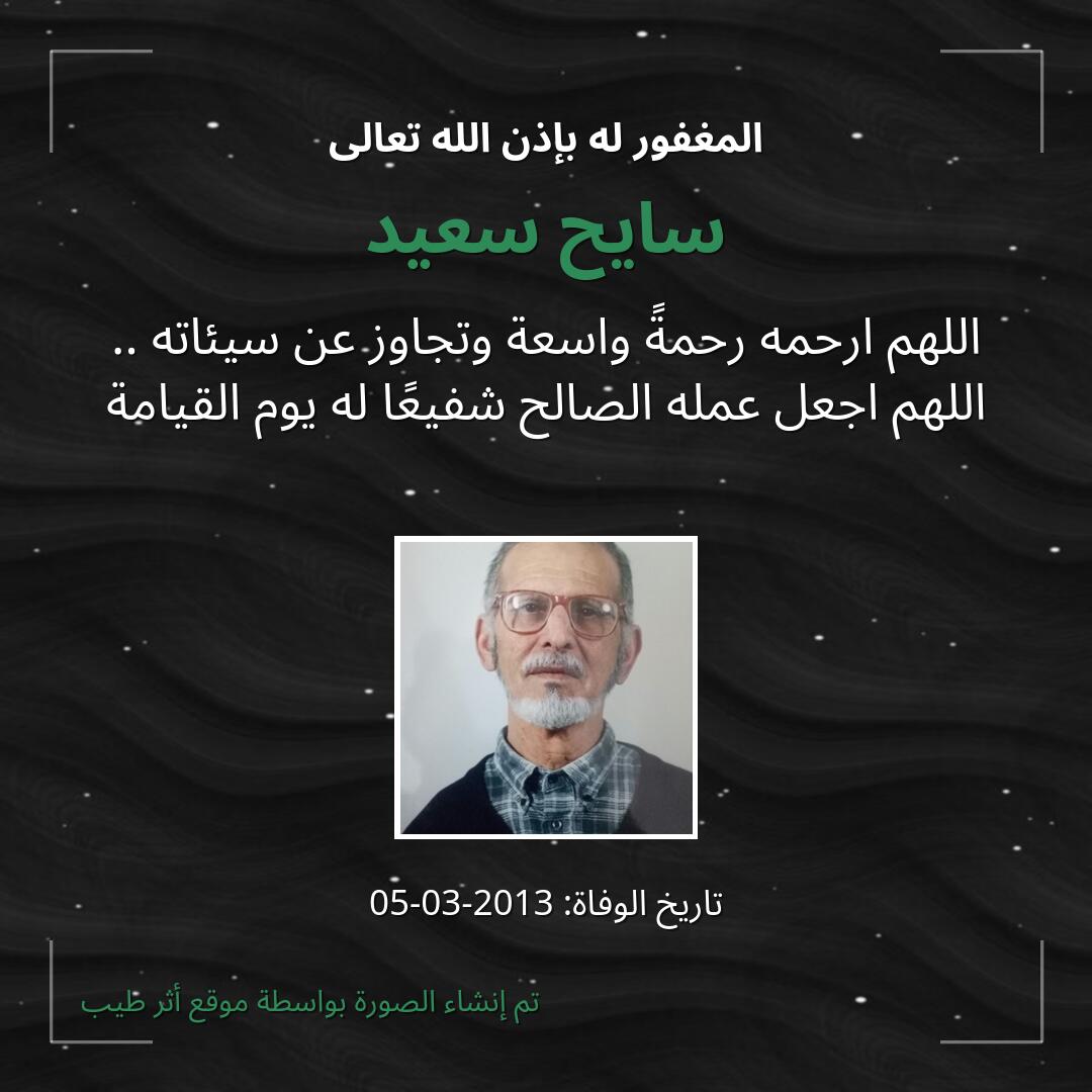 اللهم يا حنان يا منان يا واسع الغفران اغفر لـ سايح سعيد وارحمه وعافه واعف عنه، وأكرم نزله ووسع مدخله، وأغسله بالماء والثلج والبرد، ونقه من الذنوب والخطايا كما ينقى الثوب الأبيض من الدنس.