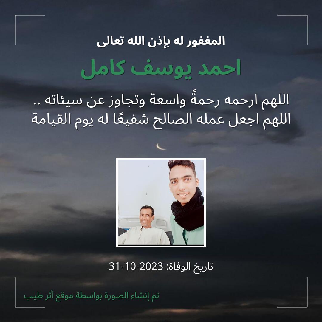 اللهمّ يمّن كتاب احمد يوسف كامل ويسّر حسابه، وثقّل بالحسنات ميزانه، وثبّت على الصّراط أقدامه، وأسكنه في أعلى الجنّات، بجوار حبيبك ومصطفاك صلّى الله عليه وسلّم.