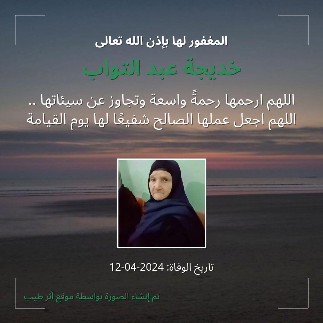 بمشاركتك هذه الصفحة، تساهم في نشر الخير والدعاء للمرحومة خديجة عبد التواب.