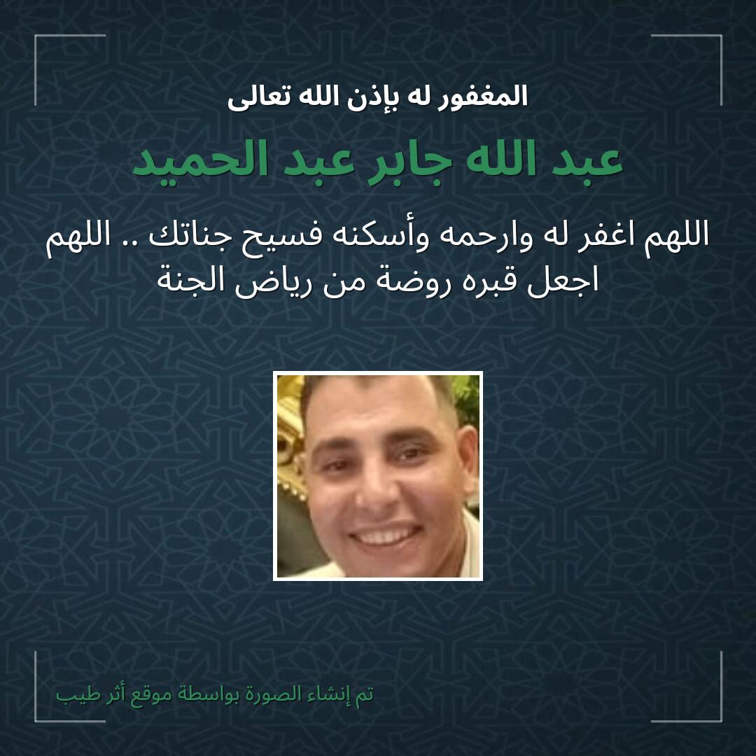 اللهم يا حنان يا منان يا واسع الغفران اغفر لـ عبد الله جابر عبد الحميد وارحمه وعافه واعف عنه، وأكرم نزله ووسع مدخله، وأغسله بالماء والثلج والبرد، ونقه من الذنوب والخطايا كما ينقى الثوب الأبيض من الدنس.
