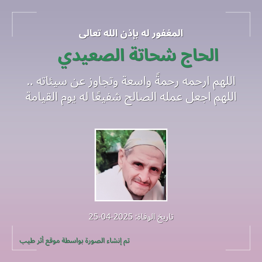 بمشاركتك هذه الصفحة، تساهم في نشر الخير والدعاء للمرحوم الحاج شحاتة الصعيدي 💚.