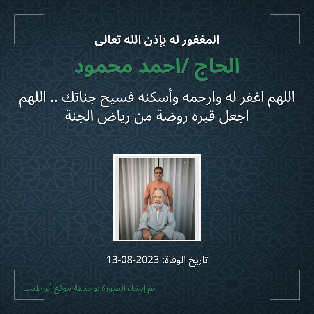 اللهم يا حنان يا منان يا واسع الغفران اغفر لـ الحاج /احمد محمود وارحمه وعافه واعف عنه، وأكرم نزله ووسع مدخله، وأغسله بالماء والثلج والبرد، ونقه من الذنوب والخطايا كما ينقى الثوب الأبيض من الدنس.