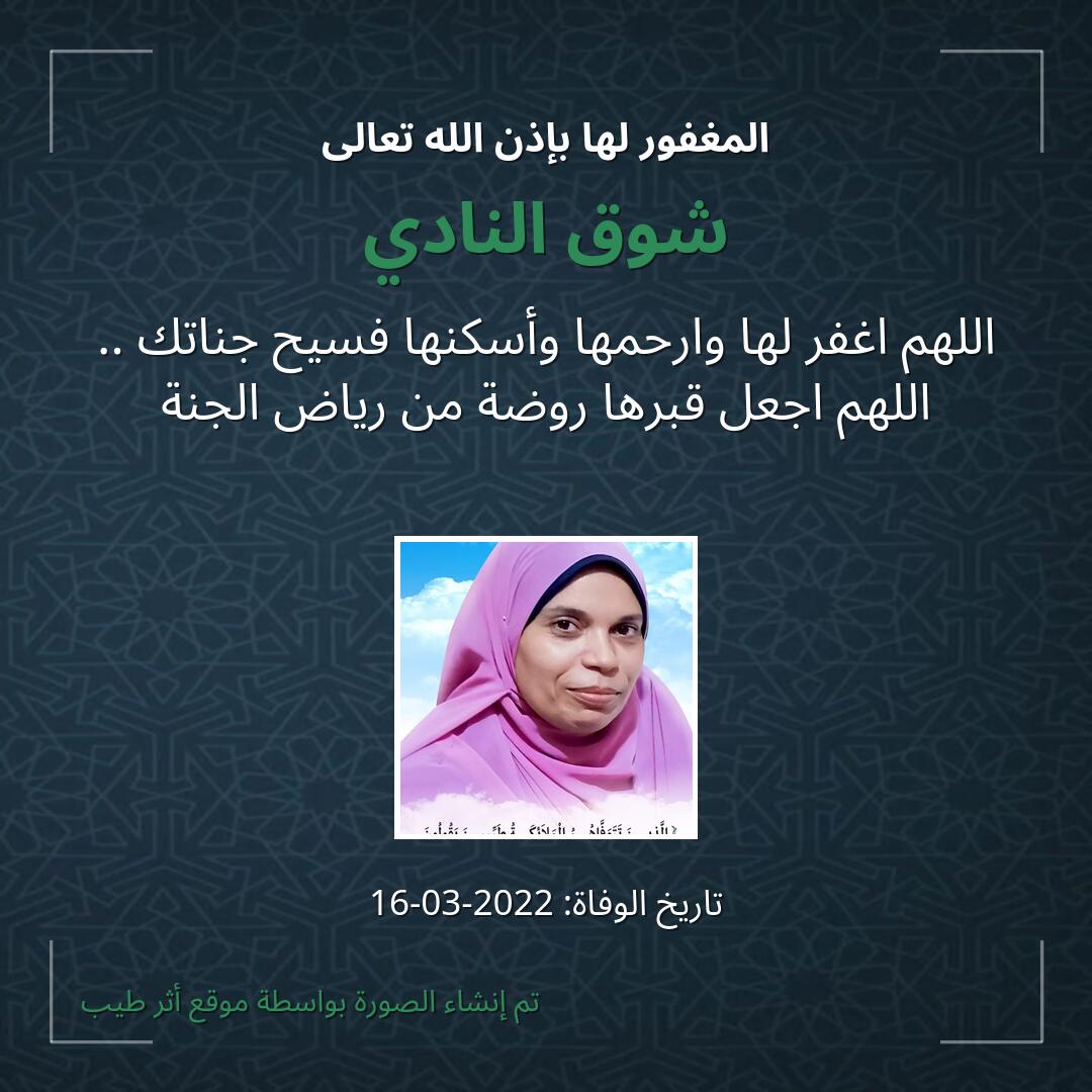 بمشاركتك هذه الصفحة، تساهم في نشر الخير والدعاء للمرحومة شوق النادي.