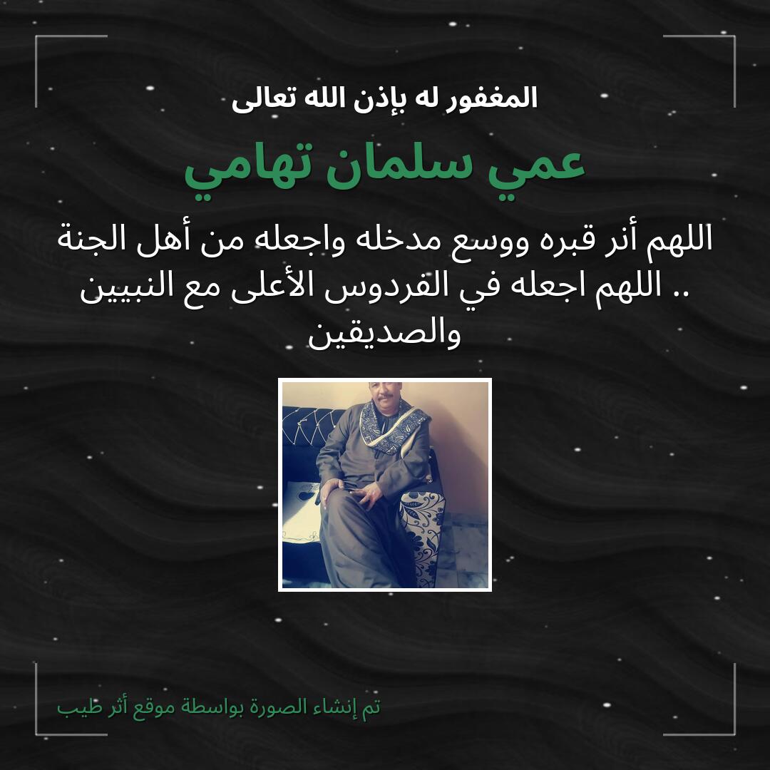 اللهم يا حنان يا منان يا واسع الغفران اغفر لـ عمي سلمان تهامي وارحمه وعافه واعف عنه، وأكرم نزله ووسع مدخله، وأغسله بالماء والثلج والبرد، ونقه من الذنوب والخطايا كما ينقى الثوب الأبيض من الدنس.