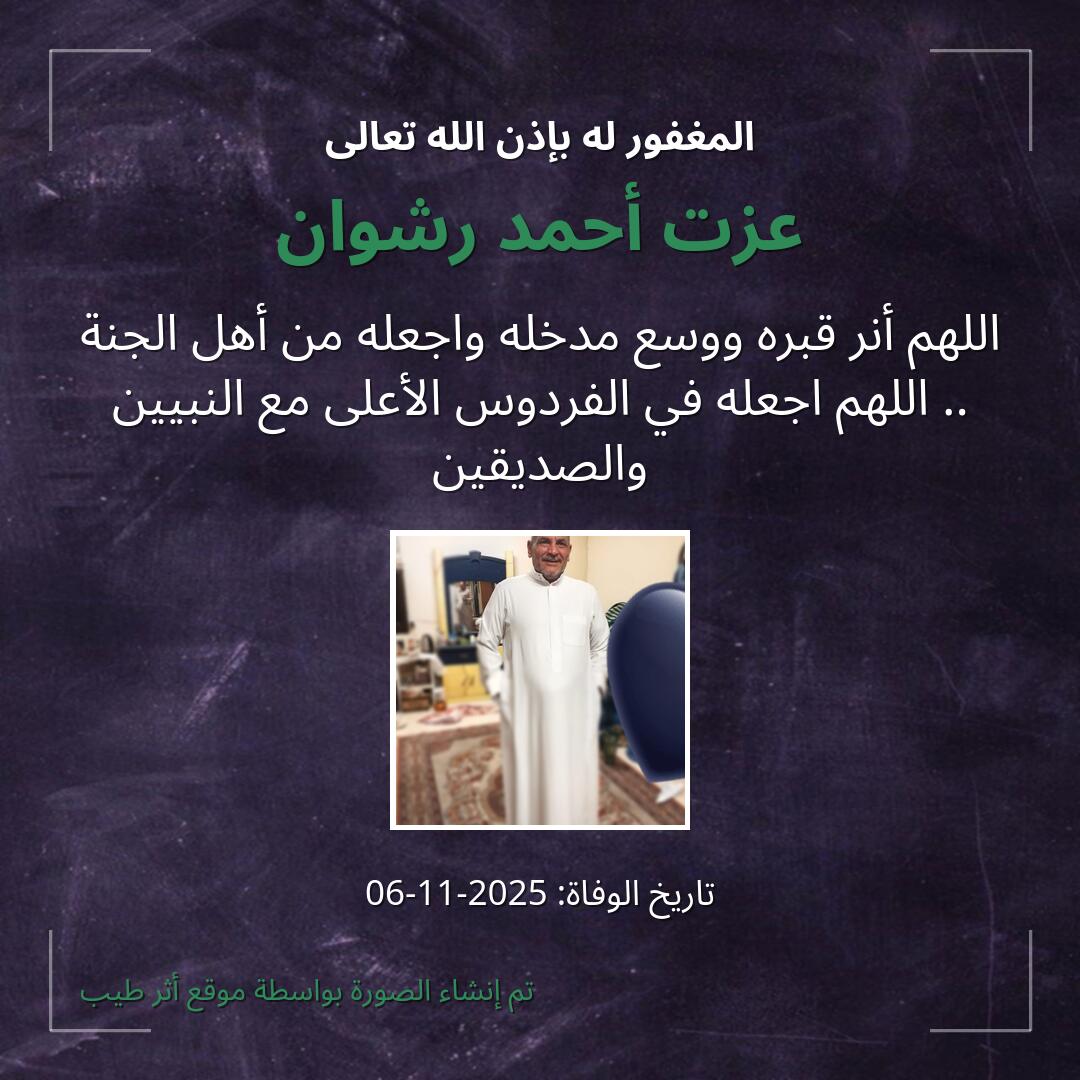 اللهمّ يمّن كتاب عزت أحمد رشوان ويسّر حسابه، وثقّل بالحسنات ميزانه، وثبّت على الصّراط أقدامه، وأسكنه في أعلى الجنّات، بجوار حبيبك ومصطفاك صلّى الله عليه وسلّم.